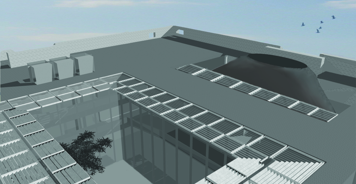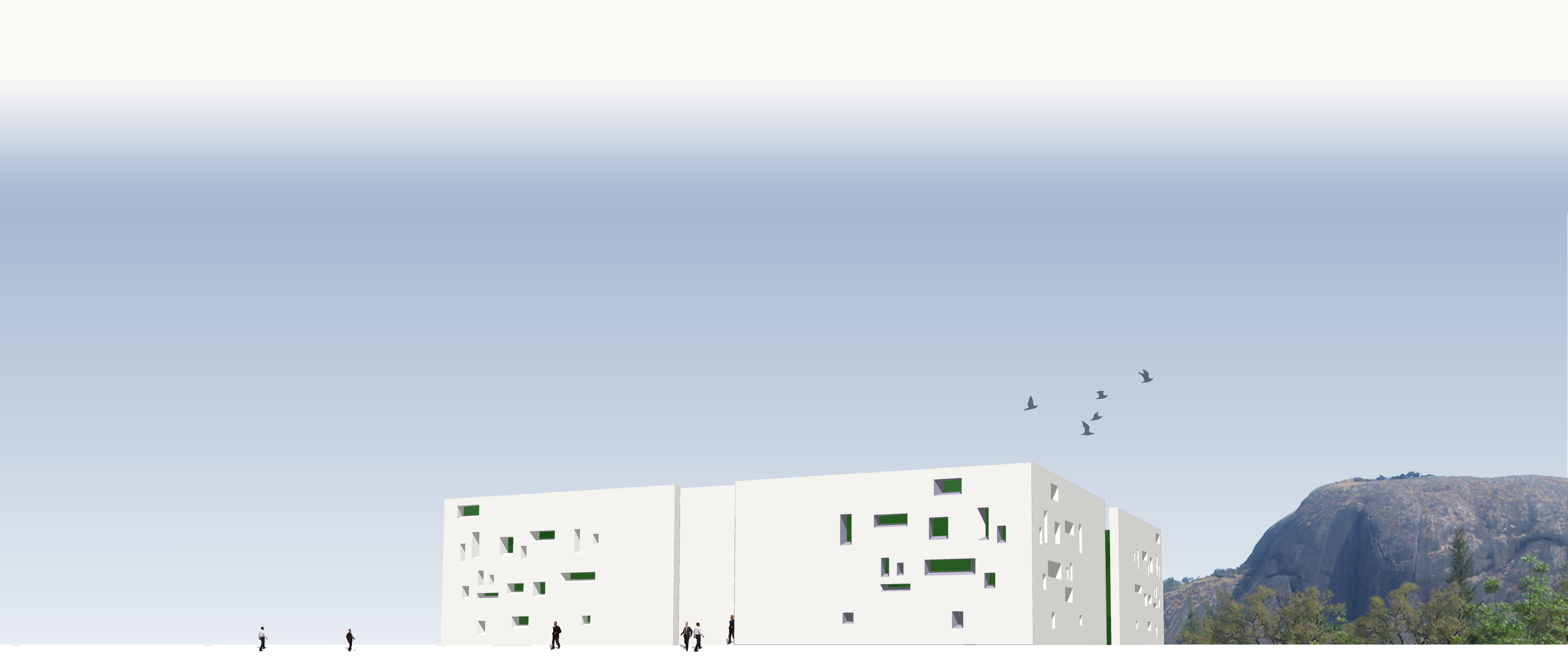 thermal mass and thus environmental control, provide solar shading for windows, as do the concrete floors. A mixed ventilation system, powered by solar panels and natural stack effect ventilation limit total reliance on air conditioning or comfort cooling systems.