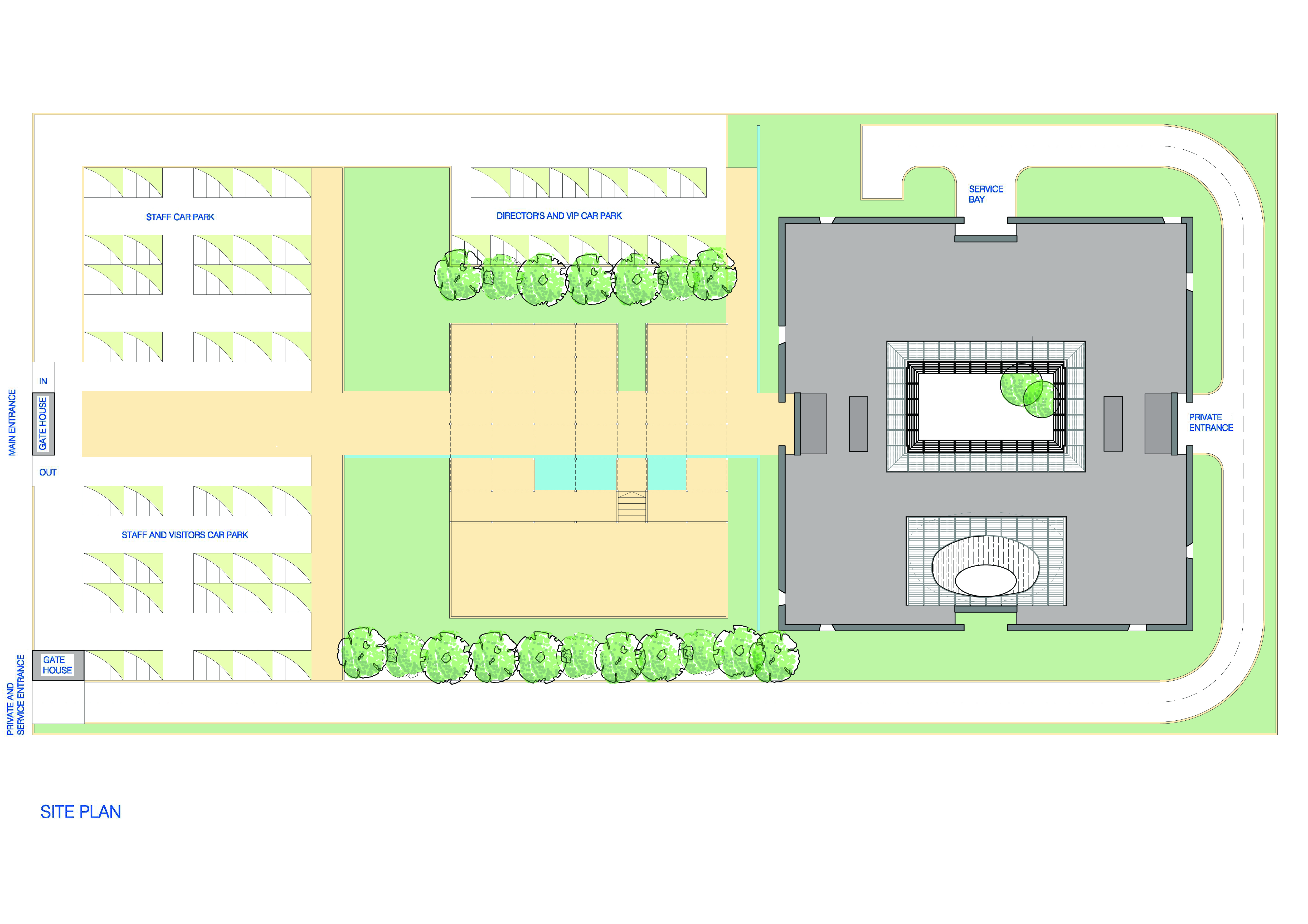 Develop produced design proposals for a new commercial headquarters building in asokoro, abuja. the development provides over 120,000sqft of office space, auditorium and exhibition space. offices spaces include principle staff suites, cellular, open plan, operations and archive rooms. tiered security, designed, allows for controlled visitor access to the auditorium and exhibition spaces.